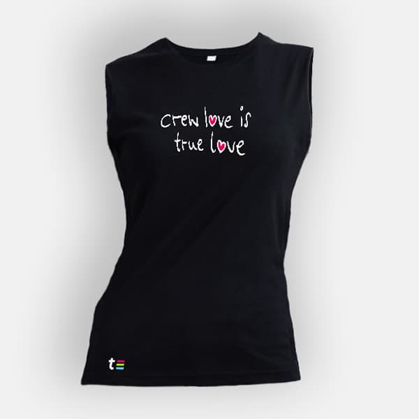 Produkt: „Mantis Women´s Raw Tank T, Schwarz mit teamazing Logo am Nacken und unteren Bund sowie Crew Love is True Love Design / Damen